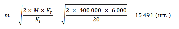 где n – количество партий, M – годовой объем реализуемого товара, m –наиболее приемлимый размер партии, произведенный без перерыва либо перенастройки технологического процесса.