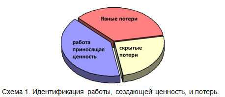 Потери существует в двух основных формах: явные потери, скрытые потери (см. схему 1). Явные потери легко обнаружить. Например, бракованные детали, излишние запасы, чрезмерный расход энергии и т.д. Скрытые потери имеют место в операциях, которые приходится выполнять в данных условиях или по данным методикам, но которых можно избежать, если улучшить технологии или изменить условия. Например, транспортировка деталей, замена инструмента, проверка качества, многочисленные манипуляции с деталями и др.