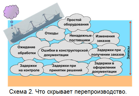5. Наличие любых, кроме минимально необходимых, запасов. Ненужное складирование и слишком большие запасы являются замораживанием капитала.Запасы требуют расходы на хранение, порождают плохое качество, требуют площади, время на поиски, скрывают простои и т.д.