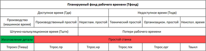 Доступное время - интервалы времени, в течение которых оборудование производит продукцию или готово к производству. При этом станок находится в рабочем состоянии, в наличии оператор, заготовка, инструмент и т.д. Состоит из 3 частей: