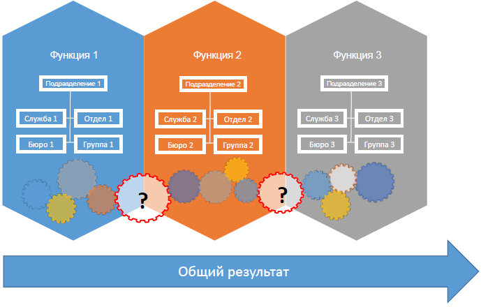 Когда же необходимость в горизонтальном взаимодействии между «бункерами» все-таки объективно возникает, то «бункеры», отрабатывая свое название, занимают позицию бескомпромиссной обороны. И место эффективного взаимодействия занимают бесконечные споры о том, кому из «бункеров» следует выполнить ту работу, которую они не могут разделить между собой (Рис. 2).