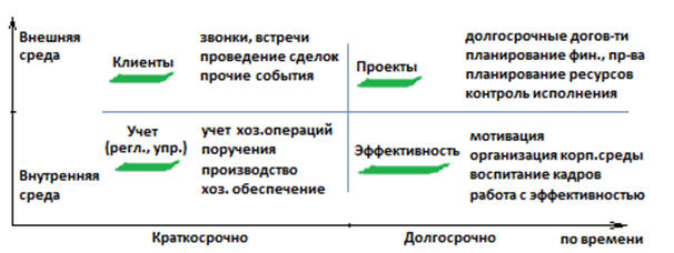 Расположим действия, которые совершает организация в простых квадрантах:оценках краткосрочной и долгосрочной перспективы, и выполнения действияво внутренней и внешней среде (Рис. 1).