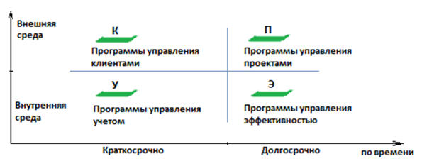 Если мы переформулируем эти группировки в терминах информационных систем, то получим следующую карту категорий информационных систем (ИС) в краткосрочной и долгосрочных перспективе, во внутреннем и внешнем окружении (рис. 2).