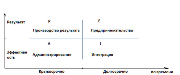 2. «Для успешного функционирования организации необходимо, чтобы внутри организации выполнялись четыре функции: производство результатов, администрирование, предпринимательство и интеграция. Для успешного выполнения каждой функции должны выполняться роли в принятии решений P,A,E,I»