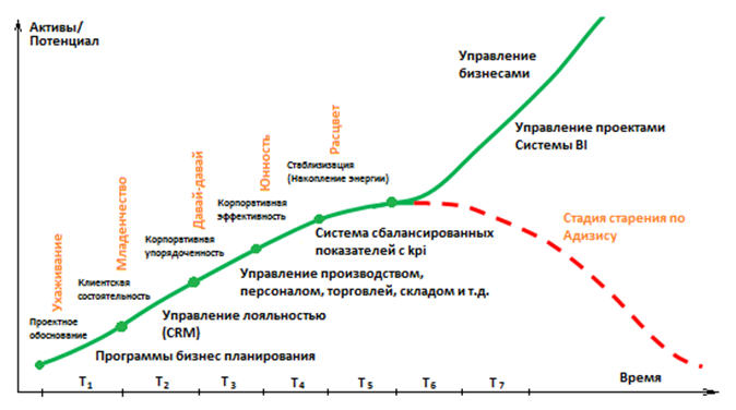 Рис. 7. График соответствия этапов развития компании по Адизесу этапам развития информационных систем и категории информационных систем.