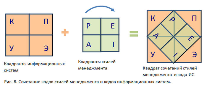 Для динамичного развития организации и успешного перехода из одного этапа развития организации на следующий эволюционный этап, необходимо формировать информационную среду основанных на кодировке КУПЭ (CAPE) и использовать ее с применением менеджерских стилей РАПИ (PAEI). При этом эффективные сочетания менеджерских стилей и кодов информационных систем иллюстрируются квадратом сочетаний кодов стилей менеджмента и кодов информационных систем (Рис. 8).
