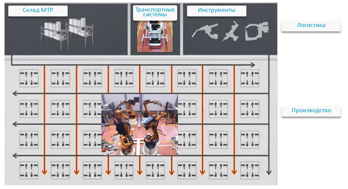 Концепция матричного производства состоит в том, что сборочные операции в цехе выполняются не на жестко организованном последовательном конвейере, а внутри отдельных стандартных производственных ячеек, которые размещаются в цехе в узлах регулярной сетки – матрицы. В ячейках устанавливаются промышленные роботы и поворотные столы с необходимой технологической оснасткой, приемные приспособления для инструментов, специализированное оборудование. Ячейки за счет сменного инструмента и оснастки могут перенастраиваться на различные технологические операции: либо производственные – сварка, сборка узлов с помощью резьбовых соединений и т.д., либо операции контроля – неразрушающий контроль материалов, 3D-сканирование формы сложных изделий и т.д.