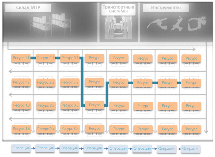 Система в ходе планирования сначала пытается использовать основной Ресурс, но если он для данного момента времени занят, смещается по вертикали на альтернативный Ресурс (ячейку) и т.д. (последовательность использования производственных ячеек матрицы показана сплошной синей линией).