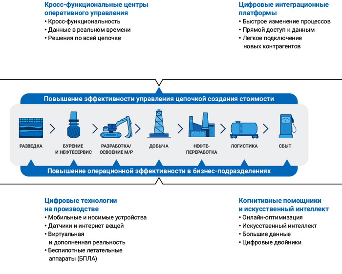 Это очень яркие, но, наверное, недостаточно релевантные примеры из-за довольно скромного масштаба бизнеса «Акера» и тем более «Вудсайда». Однако по пути цифровой трансформации идут все лидеры мирового нефтегазового рынка, и «Газпром нефть», поставившая себе стратегическую цель стать к 2030 году отраслевым бенчмарком по эффективности, технологичности и безопасности, конечно, не исключение. Поэтому вместе с долгосрочной корпоративной стратегией развития компания разработала и стратегию цифровой трансформации.