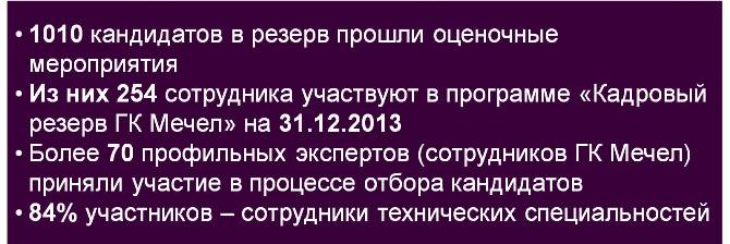Подготовка кадрового резерва ведется в «Мечеле» на проектной основе. Первый отбор кандидатов проходил в 2011-2012 гг. Сотрудниками кадровых служб была проведена огромная подготовительная работа на местах. В частности, неоднократно проводились разъяснительные беседы с потенциальными кандидатами и руководителями предприятий, была организована конференция с директорами по персоналу предприятий и дивизионов, на которой обобщили опыт предприятий по подготовке управленческого резерва, определили основные подходы и единые принципы дальнейшей работы в едином ключе по основным предприятиям Группы.