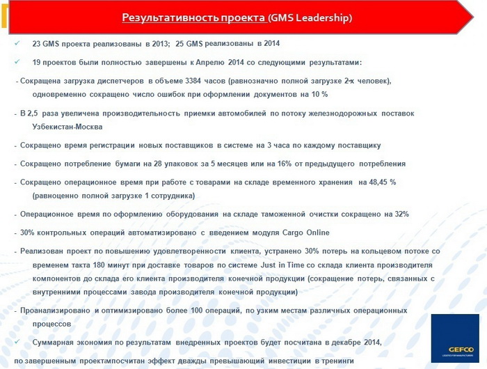 GEFCO Management System (GMS) соединяет в себе все доступные инструменты, гарантирующие эффективность работы во всех направлениях деятельности компании.