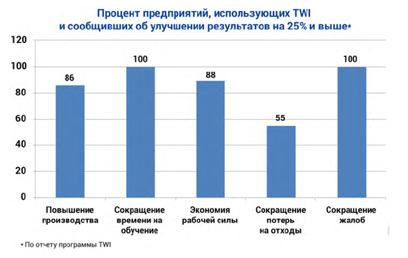 Эффективность службы TWI в ходе войны была поразительной. Отчет об обучении на производстве 1940-1945 предоставляет много подробностей результатов программ.