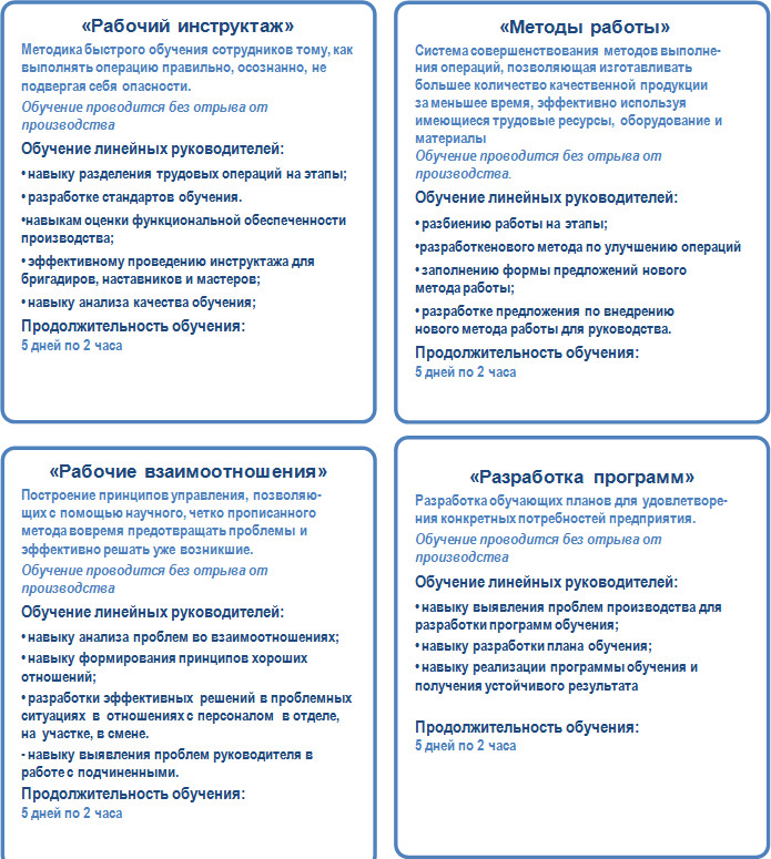 Принципы формирования профессиональных навыков через «обучение действием», заложенные в программе «TWI – обучение в промышленности» являются не только методологической базой «японского экономического чуда» но и стандартами производственного обучения ведущих промышленных корпораций,