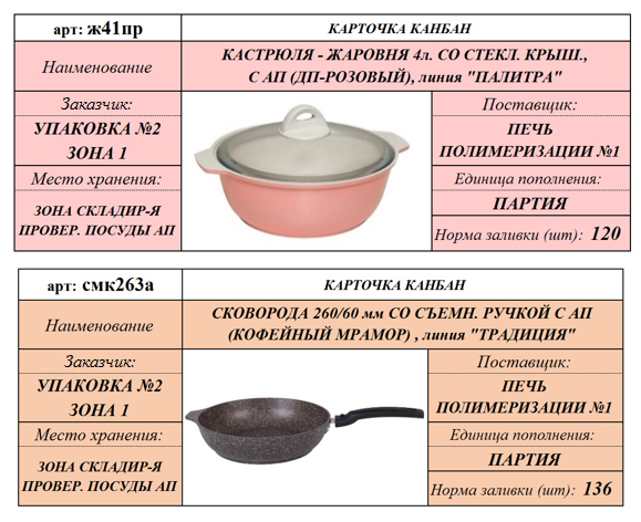 Количество карточек определялось в зависимости от той группы, в которой оказывалось изделие. Ограничение количества запущенных в работу карточек «канбан» является регулятором загрузки мощностей участков и позволяет ограничивать объем незавершённого производства: