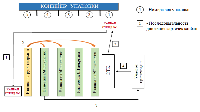 3. Рабочие грунтовочного конвейера, выполнив заказ, отправляют партию изделия вместе с карточкой дальше по потоку. После прохождения всех последующих операций, карточка возвращается на стенд «УПАКОВКА».