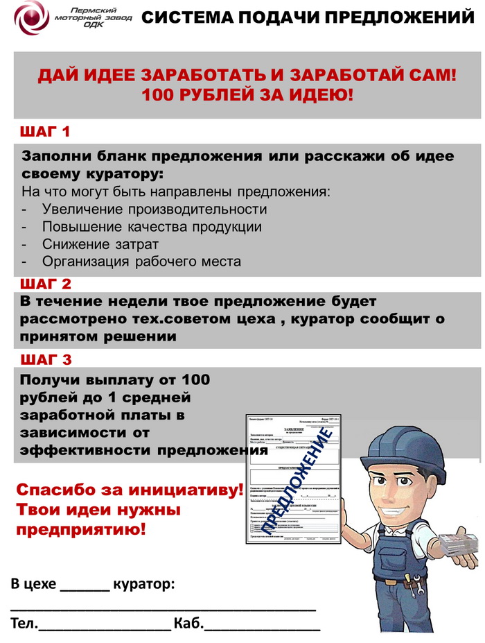 ШАГ 1. Рабочий заполняет бланк (он, кстати, единый и для предложений по улучшениям, и для рационализаторских предложений) или озвучивает свою идею/проблему куратору по подразделению.