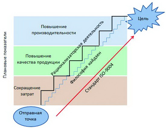 Существует еще одна концепция, позаимствованная западниками у предприятий Японии. Понятие кайдзен уже не ново и в российских организациях. Суть кайдзен-философии – в непрерывном совершенствовании процессов производства маленькими шажками.