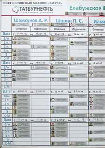 - Стенд представляет собой магнитную доску с нанесенной на ней таблицей с указанием буровых бригад, фамилий буровых мастеров, всех членов вахт, дат выезда и приезда с буровой, а также работников, не задействованных на скважинах, с указанием даты их выхода на работу (в отпуске, на больничном). Все работники цеха бурения представлены на магнитных табличках, где указаны: ФИО, должность, табельный номер, а также имеется фотография.