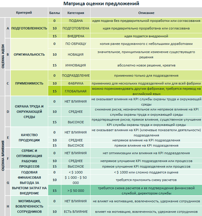 Система оценки предложений также немного поменялась. До 2015 года у нас действовала накопительная система поощрений: коллеги подавали предложения и набирали баллы (оценивался уже сам факт подачи). По результатам года за принятое предложение можно было получить приз. Затем произошел переход на материальное поощрение каждого поданного предложения в зависимости от баллов, которое оно набрало. Сегодня минимальная оценка за принятое к рассмотрению предложение составляет 500 рублей (при наборе от 30 до 39 баллов), а максимальная за внедренное предложение – до 15 тыс. рублей (70-100 баллов).