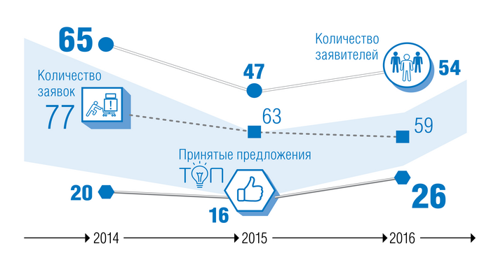 – В прошлом году количество заявителей вновь увеличилось до 54 человек, – продолжает Николай Манин. – Было подано 59 предложений, 26 из них приняты. Значительно улучшилось качество идей, большинство из них принималось сразу или отправлялось на доработку. Также 2016 год был отмечен максимальным количеством предложений с разовыми премиями, таких было 11, они также имели значимый экономический эффект. Не принятых всего 15 идей. Затраты на реализацию Предложений ТОП в 2016 году отсутствовали, а ожидаемый эффект составил 33 миллиона рублей.