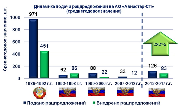Вернемся к нашим цифрам. Почему количество внедренных рацпредложений 1986-1992 гг. в разы превышает статистику 2013-2017 гг.? По утверждению специалистов, первая причина кроется в безвозвратно ушедшей в прошлое вместе со строителями социализма системы организации соцсоревнований. На победу в состязании цехов и производств напрямую влияли внедренные рацпредложения. Во-вторых, по заводу сильно ударила перестройка: акционирование и разделение собственности, потеря квалифицированных кадров, сокращение выпуска ВС. Получение заказа на производство модернизированных транспортников Ил-76МД-90А вызывает всплеск активности рационализаторов. Именно поэтому цифры растут на 282% по сравнению с периодом упадка.