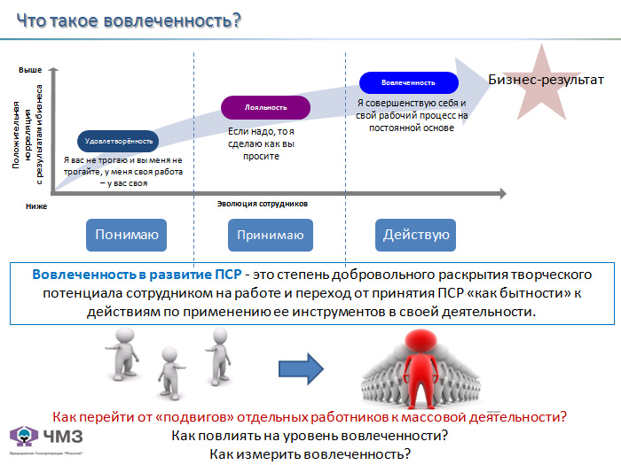 Вовлеченность в развитие производственной системы (ПС) - это степень добровольного раскрытия творческого потенциала сотрудником на работе и переход от принятия ПС «как бытности» к действиям по применению ее инструментов в своей деятельности.