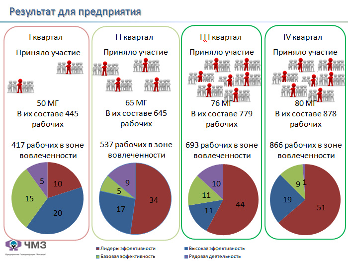 Позади сложная работа по созданию системы оценки эффективности, обучения лидеров малых групп и руководителей. Впереди интересная работа по совершенствованию предприятия в сотрудничестве с вовлеченными сотрудниками!