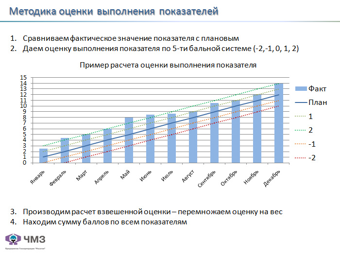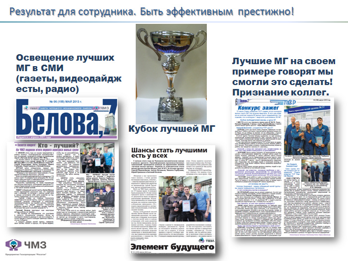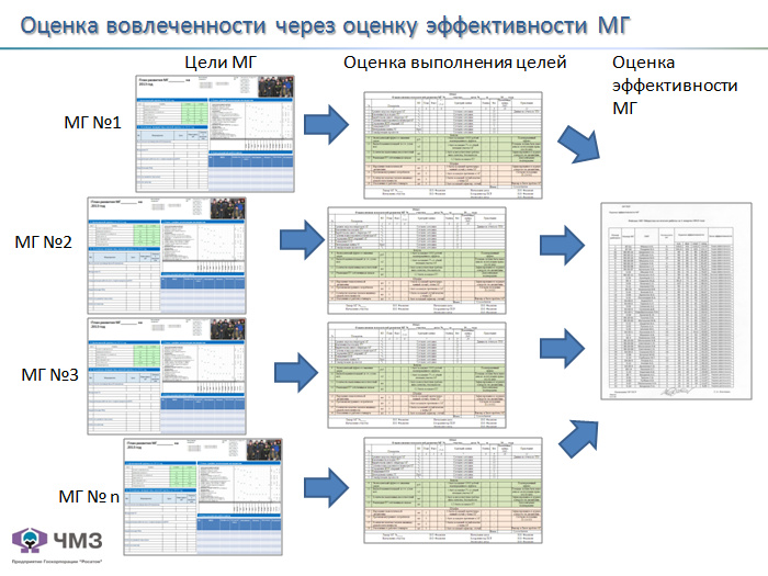 В начале 2013 года каждая малая группа совместно со своим руководством по предложенным показателям эффективности разработала план развития, в котором определила базовое значение показателей и их целевые значения на конец года. По окончании процедуры разработки планов развития малых групп была разработана и введена в действие (с 11.02.2013) система оценки эффективности деятельности малых групп (далее МГ). Данная система представляет собой конкурс МГ, основанный на измерении эффективности деятельности МГ в единой бальной системе по 16 ключевым показателям деятельности МГ. С целью методической поддержки было создано Положение о конкурсе на лучшую МГ. Конкурс проводится каждый месяц и позволяет сравнивать достижения МГ, несмотря на их различную специфику производства (гидрометаллургии, металлургии, химических производств, механообрабатывающих и т.д.). Для участия в конкурсе МГ достаточно сформировать отчет по достижению своих целевых показателей. За достижение определенного уровня показателя начисляются баллы соответствующие бальной оценке достижения целевого уровня показателя.