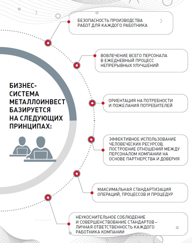 В Металлоинвесте существует единый подход к формированию набора инструментария и методологии развития Бизнес-Системы, но в то же время мы приветствуем самостоятельность, гибкость, креативность мышления и создание новых инструментов, лучше других подходящих для решения конкретной задачи, что дает возможность появления и отбора новых лучших практик. А для каждого сотрудника участие в проектах Бизнес-Системы на своем предприятии — это возможность практической реализации своего потенциала и амбиций.