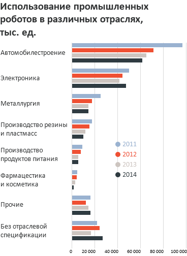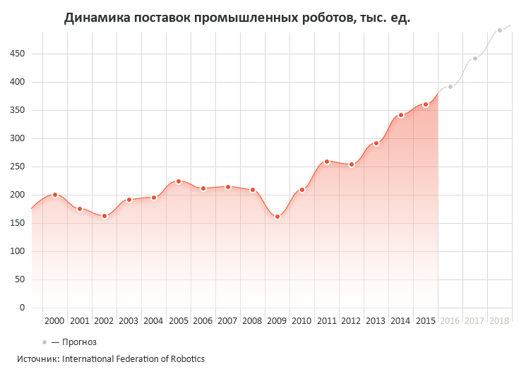 По данным Международной федерации робототехники, в 2014 году в мире в среднем на 10 тыс. рабочих приходилось 66 роботов. Лидерами по этому показателю были Южная Корея (478), Япония (314) и Германия (202). 70% всех роботов мира пришлось на эти страны плюс Китай и США. На обозримую перспективу, говорят эксперты, рост роботизации здесь едва ли застопорится. Поставки в Китай будут прибавлять на 25% в год и более, в Германию – на 5–10%, в США – на 8%.