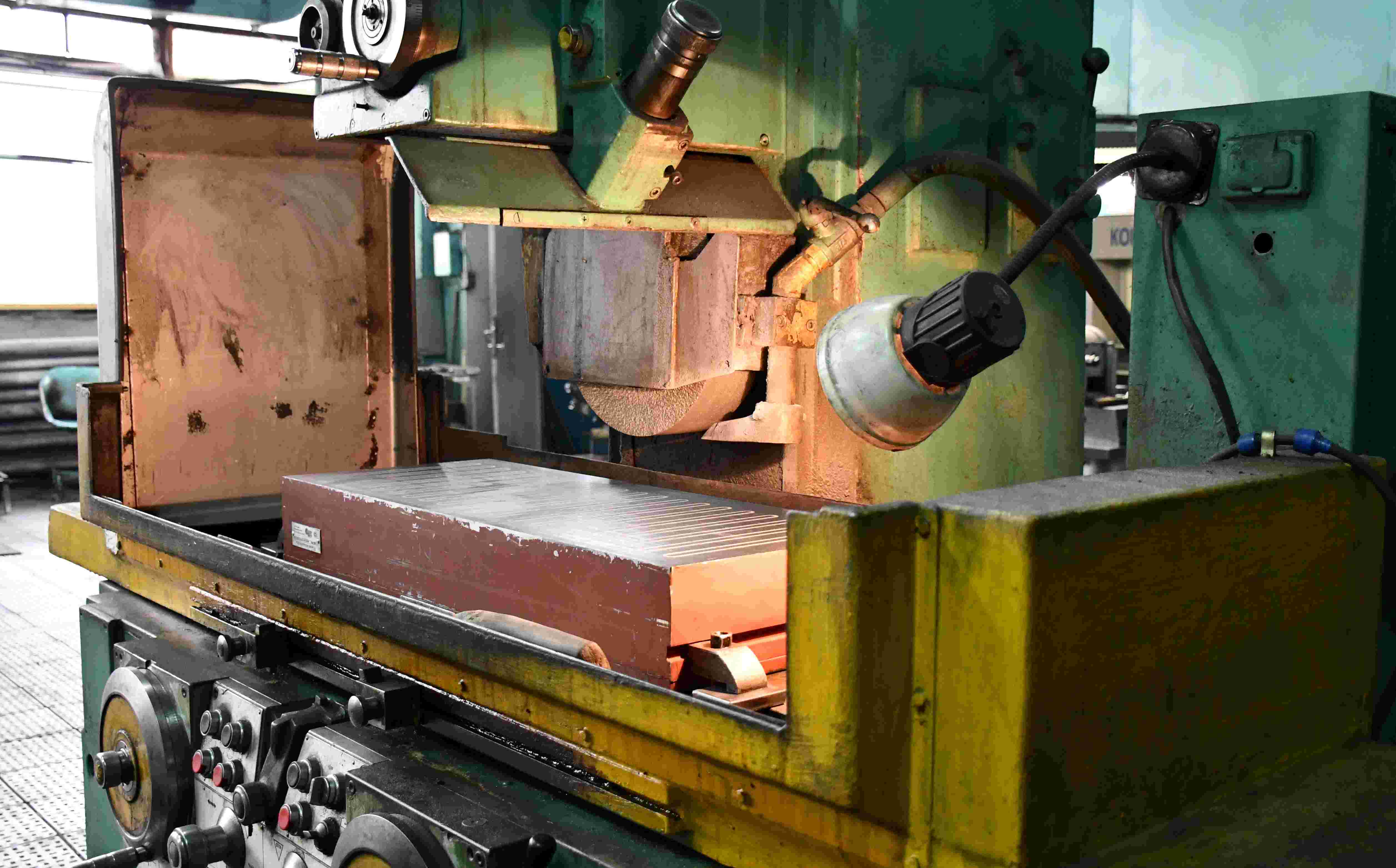 На фото: Высокий кожух (слева) не даёт разлетаться абразивной пыли