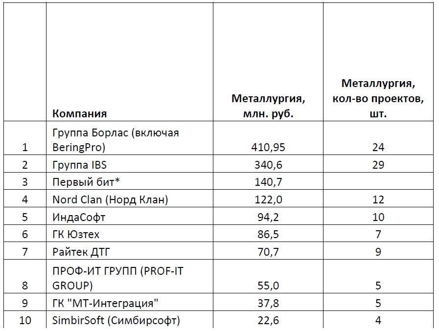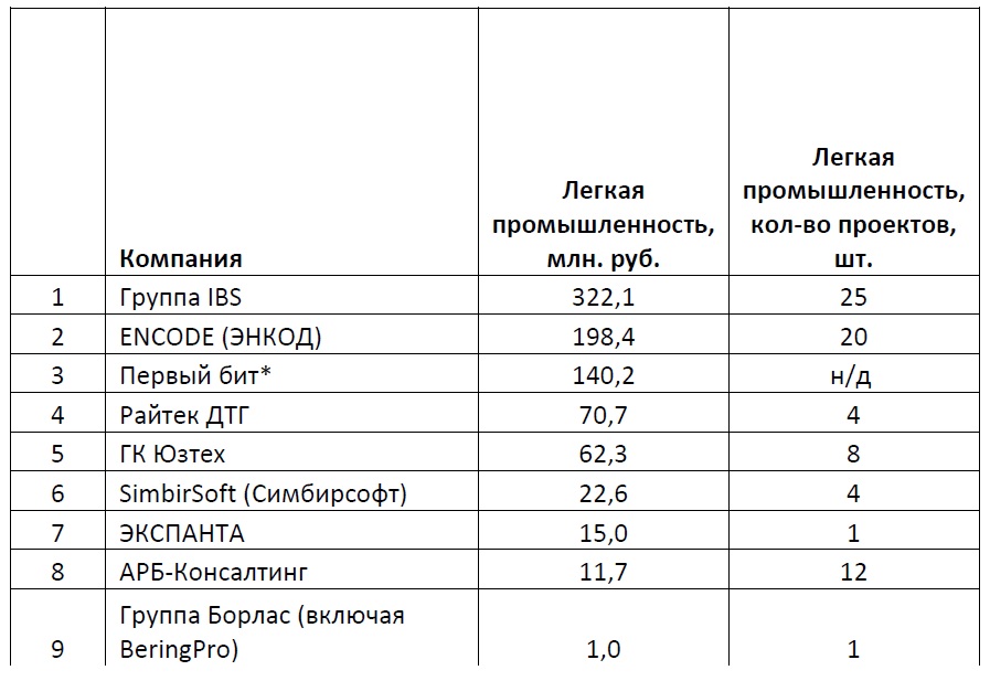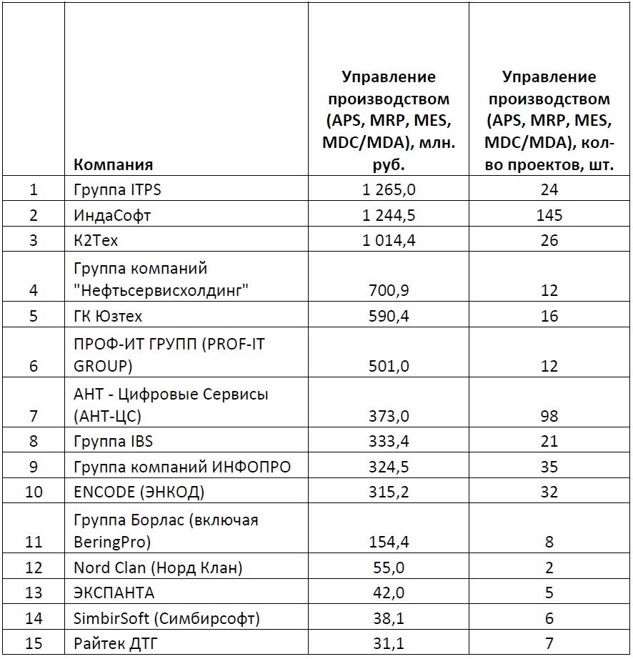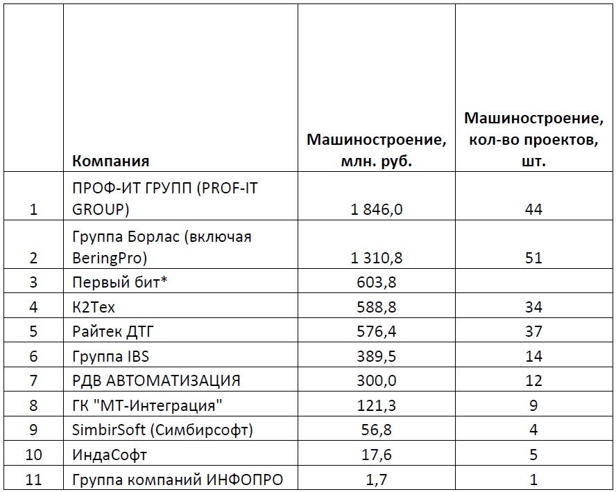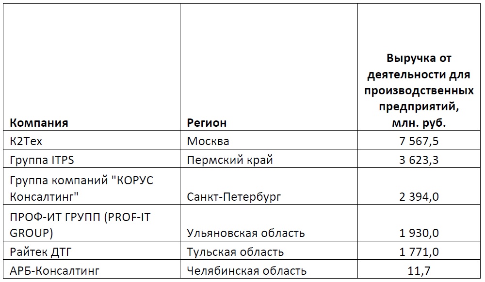 Методика проведения рейтинга: все данные были предоставлены участниками рейтинга, их анкеты были заверены руководством и печатью компании. Ключевым критерием являлись данные о выручке компаний от деятельности для промышленных компаний, для конкретных отраслей промышленности, реализации ИТ-решений. Вся информация об общей выручке компаний, доле услуг для промышленных предприятий в общей выручке, о количестве проектов – справочная; она может быть интересна и полезна как коллегам, так и потенциальным клиентам и партнерам участников данного рейтинга.