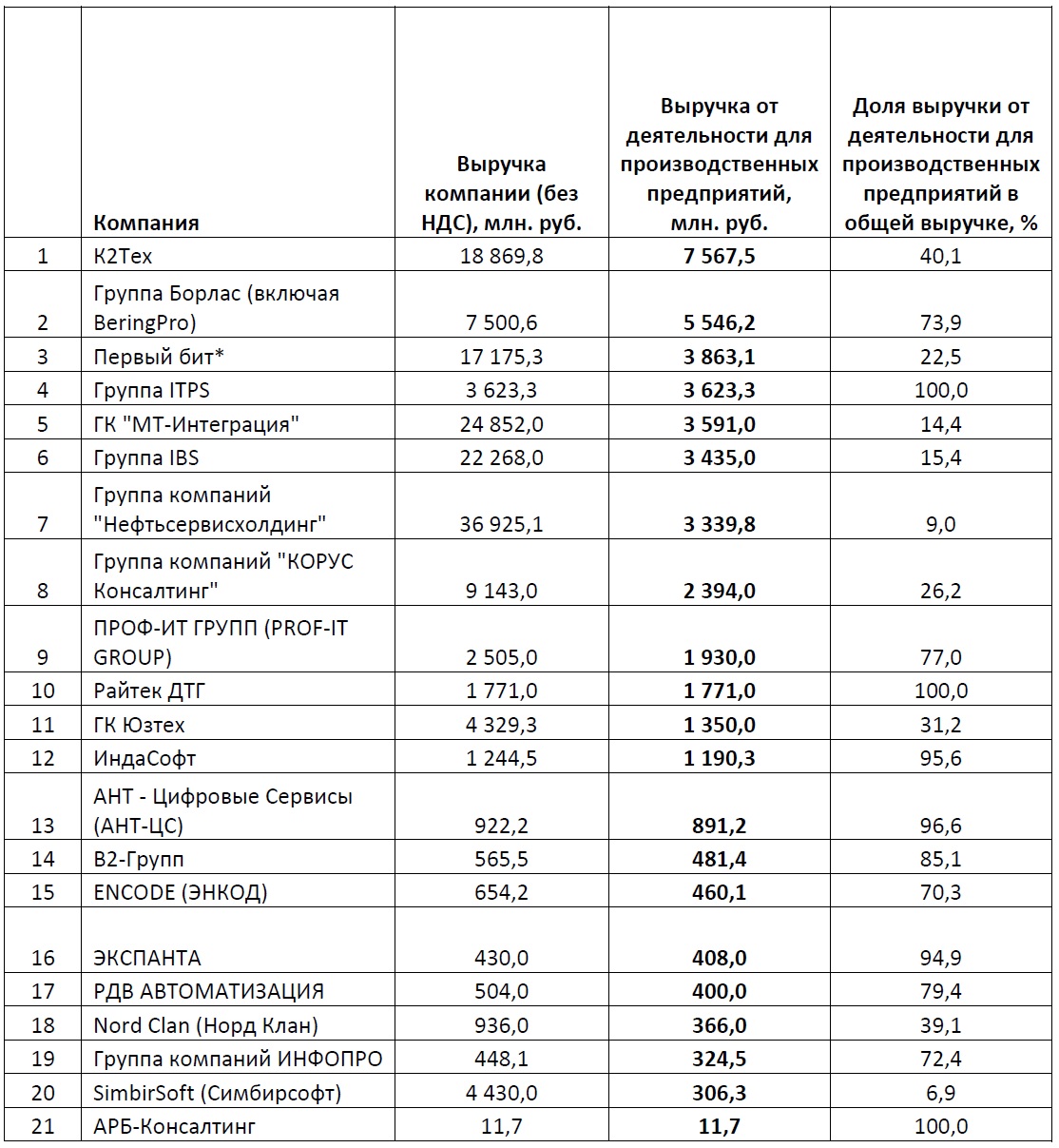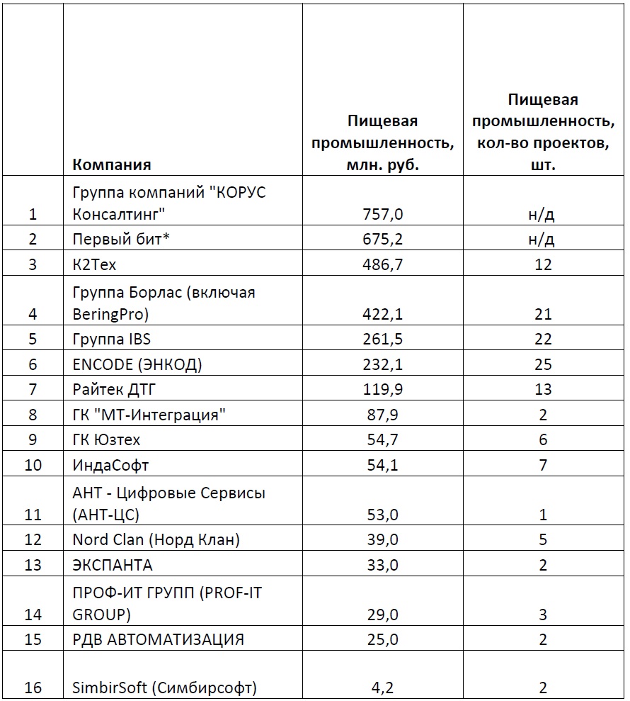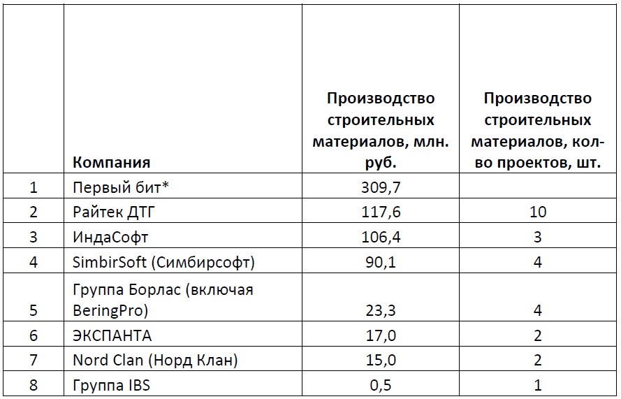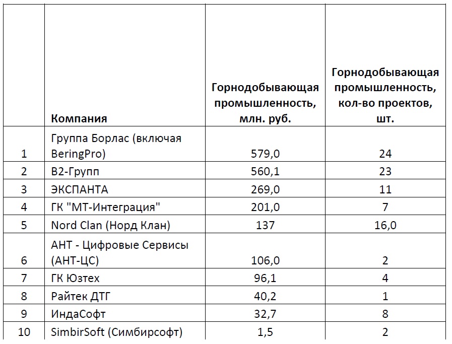 Методика проведения рейтинга: все данные были предоставлены участниками рейтинга, их анкеты были заверены руководством и печатью компании. Ключевым критерием являлись данные о выручке компаний от деятельности для промышленных компаний, для конкретных отраслей промышленности, реализации ИТ-решений. Вся информация об общей выручке компаний, доле услуг для промышленных предприятий в общей выручке, о количестве проектов – справочная; она может быть интересна и полезна как коллегам, так и потенциальным клиентам и партнерам участников данного рейтинга.