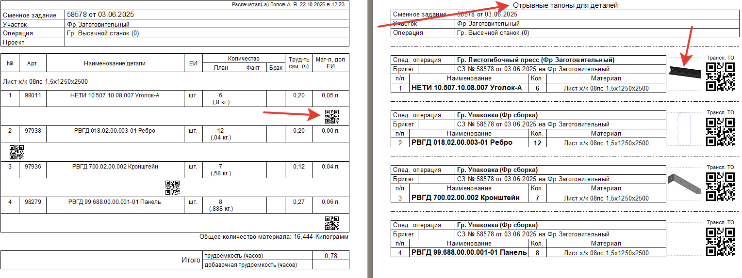 Для решения этой проблемы внедрили систему идентификации по специальным талонам, которые прилагаются к сменному заданию. На них написано, что это за деталь и куда она должна быть перемещена. Более того, на талоне есть даже эскиз детали, чтобы случайно не прицепить к ней чужой талон. Талон крепится обычным магнитом. Все, вопрос с идентификацией был снят раз и навсегда.