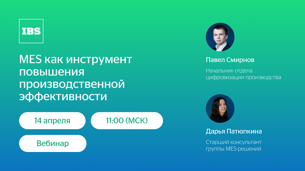 14 апреля в 11:00 (мск) Павел Смирнов, начальник отдела цифровизации производства IBS и Дарья Патюпкина, старший консультант группы MES-решений IBS представят практический опыт внедрения MES-систем. Спикеры рассмотрят критерии успешности проектов, способы сбора данных и оценку эффективности на реальных примерах.