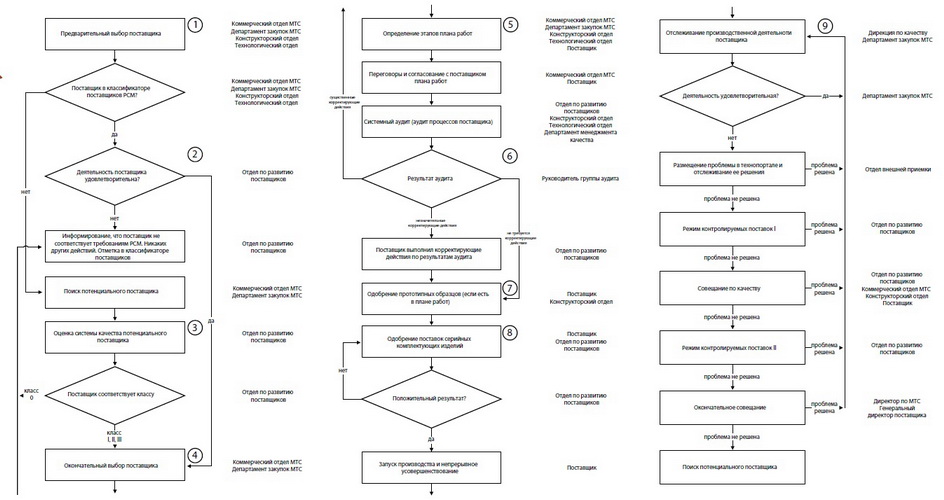 1. Предварительный выбор поставщика на этапе проектирования. Первым делом осуществляется проверка поставщиков, одобренных к серийным поставкам. Если таковых нет, – проверка оцененных поставщиков. В их отсутствие инициируется поиск и оценка нового потенциального поставщика.