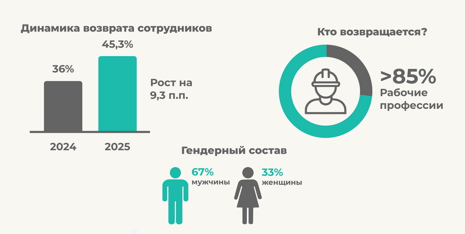 Большинство «возвращенцев» пришли на прежние должности, треть — на новые, более ответственные позиции. Это говорит о том, что в компании предоставляют возможность для карьерного роста и развития.