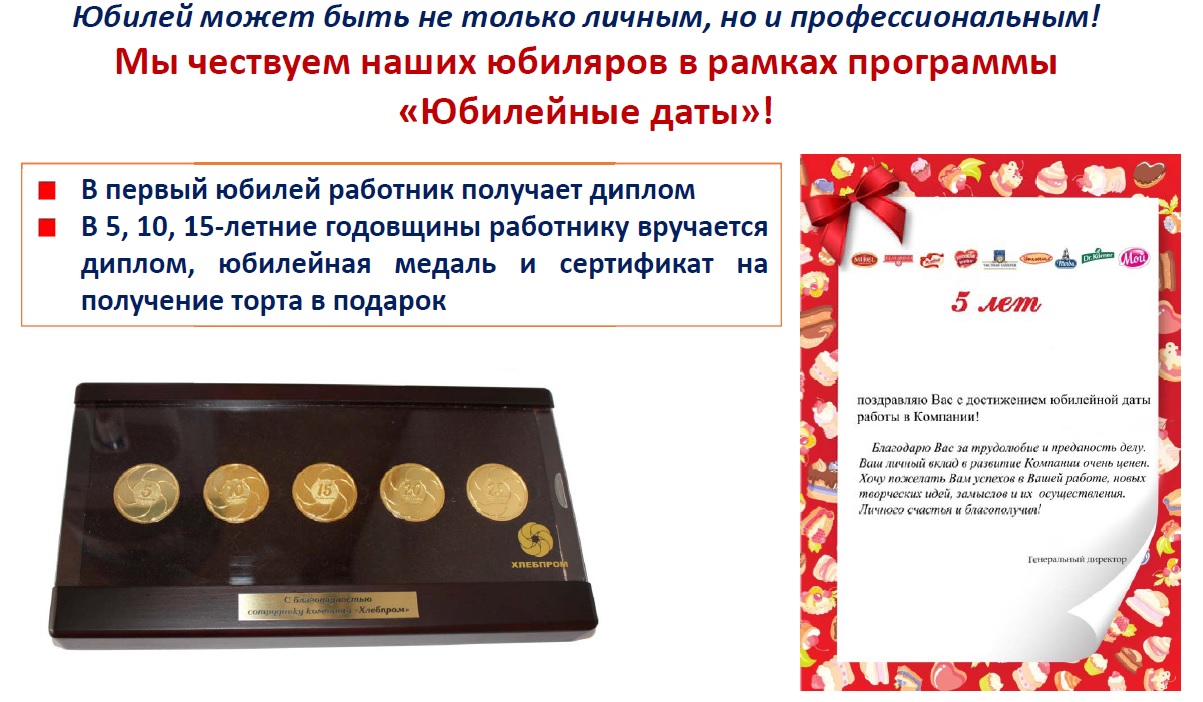 В «Хлебпроме» существует традиция поздравления коллег с юбилейными датами работы: 1 год, 5 лет, 10 лет и т.д. Самые почетные юбиляры недавно отметили 30 лет работы в компании.
