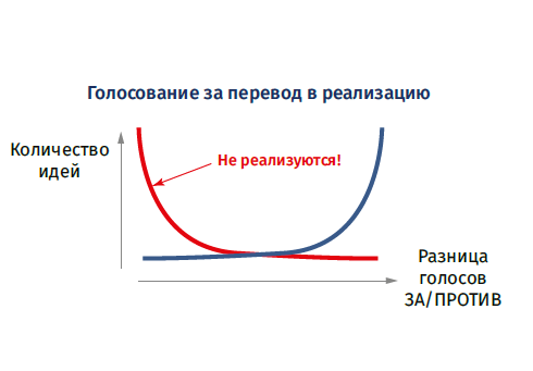 Стали разбираться, почему? Оказалось – многие из переданных на реализацию Идей были «сняты с реализации» (более 300 Идей за квартал). Анализ показал, что все эти Идеи были переведены в реализацию с отрывом в один-два голоса, то есть половина из 21 представителя рабочей группы, ответственной за перевод в реализацию, считала, что Идею стоит отклонить, а другая считала, что стоит одобрить реализацию. И исход вершил один случайный голос. Реализация таких Идей откладывалась до последнего, пока еще были другие, переведенные с большим отрывом голосов. А когда хорошие Идеи кончились и в плане остались только «одноголосые» – реализация остановилась.