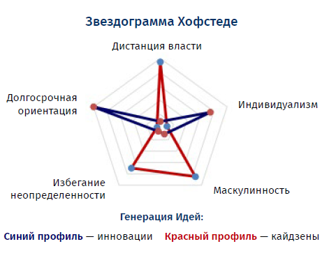 Поскольку в нашей компании мы активно применяем теорию поколений для мотивации участников Программы «Эффективность» (наша платформа инноваций) – о чем мы писали в статье «Качество идей: в чем измерить и как повысить», мы решили посмотреть, что же это за люди, чьи взгляды на звездограмме Хофстеде диаметрально противоположны.