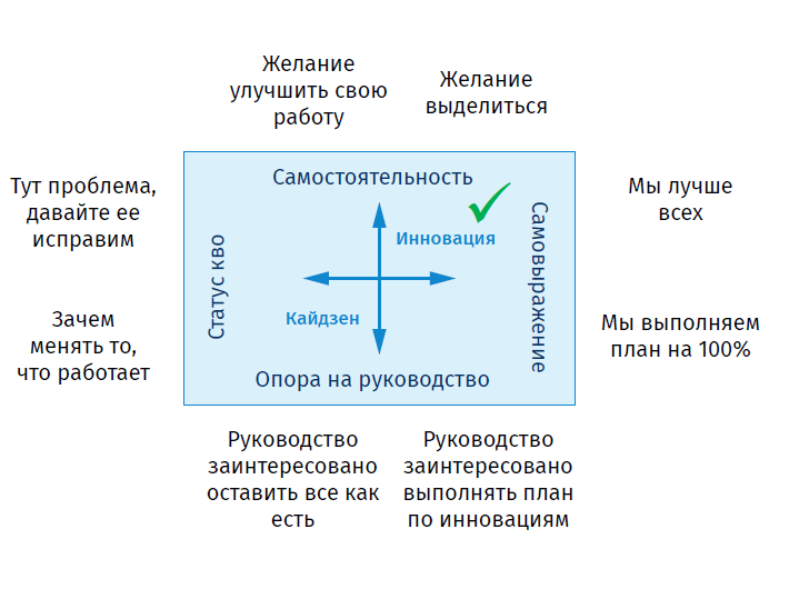 Если мы хотим примирить «враждующие» блоки, на помощь приходит закон Рональда Инглхарта, связывающий такие характеристики, как «склонность к самовыражению vs следование правилам» с одной стороны и «опора на себя vs оглядка на руководство» с другой стороны. На разных полюсах такой диаграммы рождаются совершенно разные Идеи: от кайдзен-потоков (оглядка на руководство, следование нормам и правилам) на одном полюсе до инноваций (самостоятельность и самовыражение) на другом. И этот подход очень хорошо маппингуется на нашу карту активности подразделений (Рис. 4).