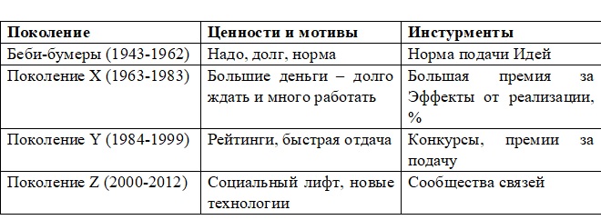 Так как Идеи подают люди. Зачем это людям? Ответ мы нашли в теории поколений – проверенный набор мотиваторов (Таблица 1).