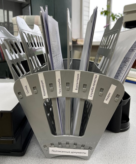 Изменения произошли не только на производстве, но и в офисах. На рабочих местах был наведен порядок, проведена сортировка, упорядочено хранение документов. Результат – сокращение времени на поиск нужных бумаг и повышение культуры документооборота. А убрав все лишнее, мы расширили рабочее пространство.