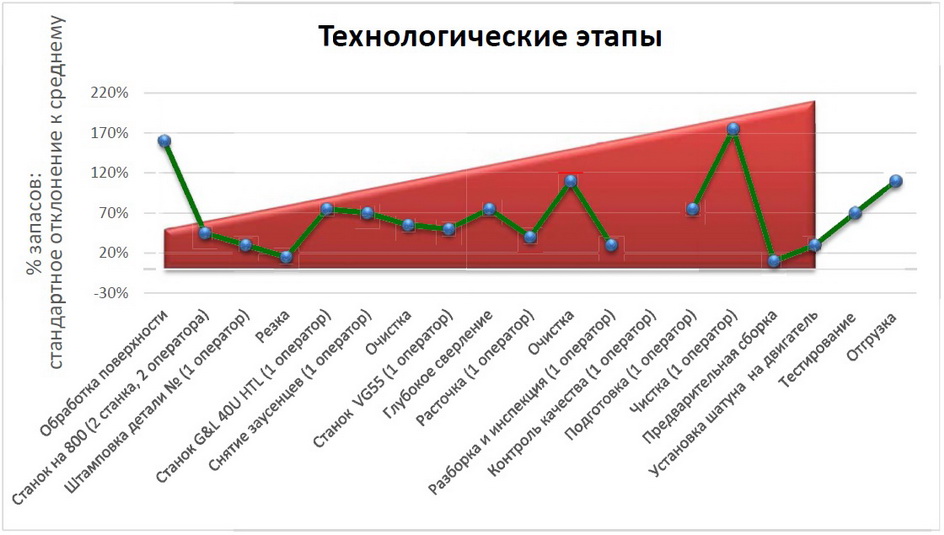 В ходе анализа процесса был составлен график накопления незавершенного производства с экстремумом на этапе задающей ритм операции (Рис. 2). Кроме того, опрос операторов показал, что с продвижением вдоль процесса чувство потери контроля над ситуацией нарастает. Из-за нестабильности процесса операторы пытались предугадать положение дел на предыдущих этапах, что неизбежно вносило еще больше колебаний в процесс.