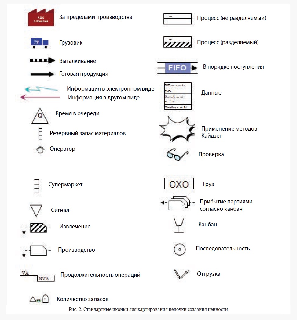 Картирование цепочки создания ценности предполагает построение карты текущего состояния и карты будущего состояния. В выборе процесса для картирования обычно руководствуются объемом производства и приоритетностью, выбирая продукт, который приносит предприятию больше дохода и который производится в больших объемах. Движение потока на карте отражают при помощи специальных иконок (Рис. 2) в обратном направлении – от последней операции к начальной. Важно также указать на карте значимые для операции данные, а именно объем запасов на разных этапах производственного процесса, расписание и порядок обращения с продуктом (работа по принципу выталкивания или вытягивания, принцип очередности FIFO («первый пришел – первый ушел») и т.д). На карте помимо потока материалов отражается и поток важной для процесса информации, прежде всего, данных о спросе, поскольку именно этот параметр задает темп всему производственному процессу.