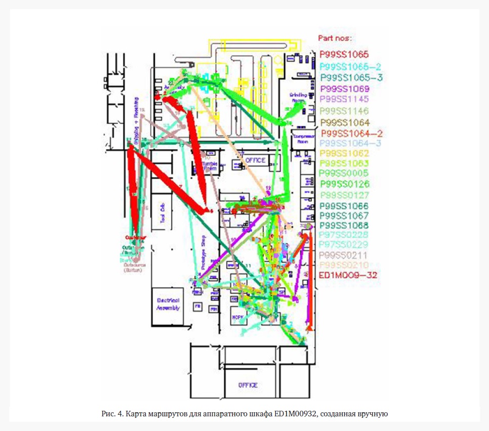 2. Визуализация потока. При помощи спецификаций продукта и технологических маршрутов компонентов можно разработать схему операций процесса и трансформировать ее в многокомпонентную технологическую карту (MultiProduct Process Chart, MPPC). При наложении этих схем на планировку завода мы получаем схему потока, которую можно использовать для разработки детальной карты сети создания ценности. Многокомпонентная технологическая карта производства аппаратного шкафа C.O.W. Industries изображена на Рисунке 4. Схема потоков, нарисованная вручную, выглядела бы крайне хаотично и перегружено (Рис. 5). Сложность процесса не позволила бы отразить потоки материалов на производстве в полной мере с использованием VSM ввиду частого возврата на предыдущие операции и пересечения разных технологических маршрутов.