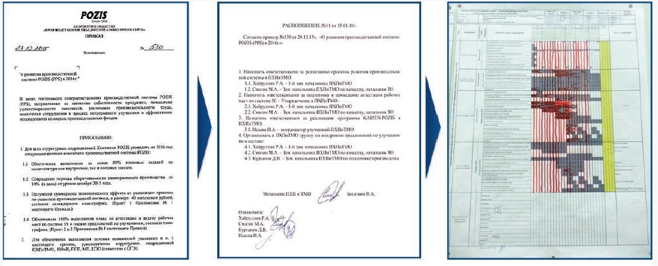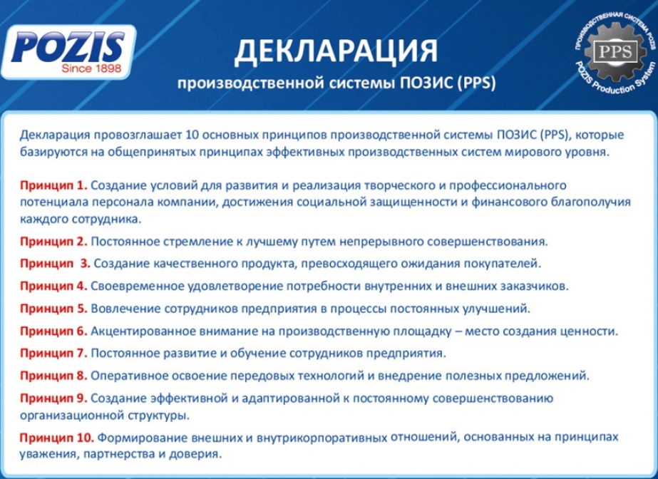 Руководство принимает во внимание, что для достижения поставленных целей необходимо менять методы и подходы к решению производственных задач. Инструменты Lean могут указывать на проблемы, однако без правильного образа мышления производственная система никогда не будет развиваться. Для достижения поставленных целей и задач была принята декларация Производственной системы POZIS и правила управления, где были закреплены основные положения производственной системы и направления деятельности по совершенствованию производственной деятельности предприятия.