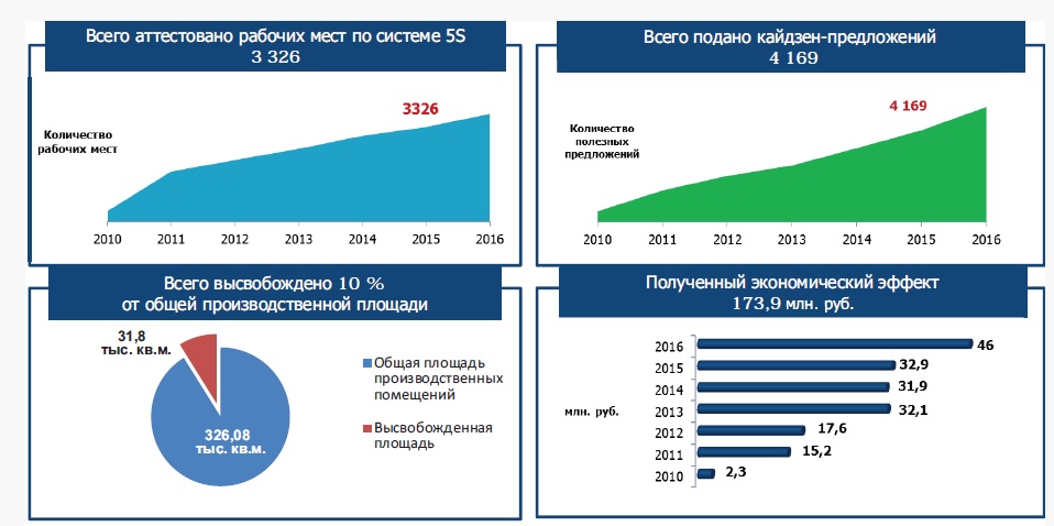 Применяемые подходы к совершенствованию производственной системы дали свои ощутимые результаты. Всего за период с 2010 по 2016 годы от применения Lean-методов на АО «ПО Завод имени Серго» был получен суммарный экономический эффект в размере 178,8 млн рублей. В соответствии с требованиями 5S было аттестовано 3 321 рабочих мест, за счет вовлечения персонала в процесс непрерывных улучшений подано 4169 кайдзен-предложений, высвобождено неиспользуемых производственных помещений 31,8 тыс. кв.м., что составляет почти 10% от общей производственной площади предприятия (рис.4).