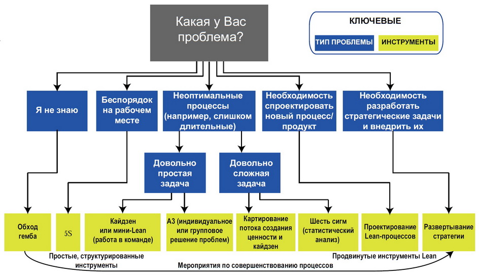 Как из множества инструментов выбрать тот, который позволит достичь поставленных целей по улучшению? На совершенствование процессов и программ в организации направлено множество инструментов Бережливого производства. Перед выбором подходящего, следует четко определить цели проекта, его масштаб, имеющиеся и необходимые ресурсы (в том числе и достаточность знаний и опыта). Упрощенная схема выбора инструмента/метода Lean в зависимости от имеющейся проблемы представлена на рис. 1.