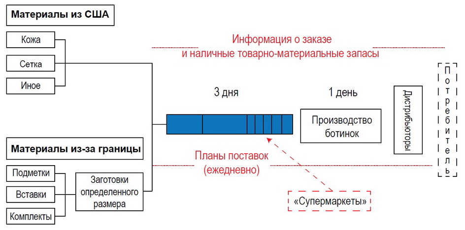 В супермаркетах находятся заготовки определенного размера и в определенном количестве, сразу в наборах. На составление графика и поставку сырья в цех уходит три дня, до четырех часов требуется для производства одной пары обуви и еще три часа – на транспортировку готовой продукции в дистрибьюторский центр New Balance.